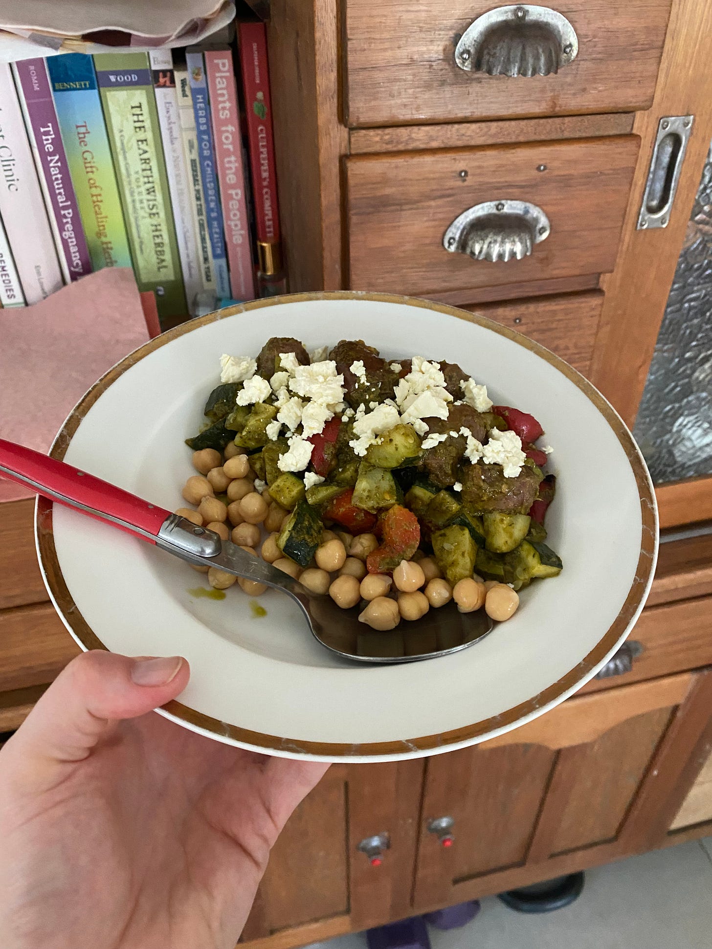 I served my daughters with pasta, while my husband and l had it with chickpeas that l tipped out of a tin and rinsed — lo-fi dinner served.